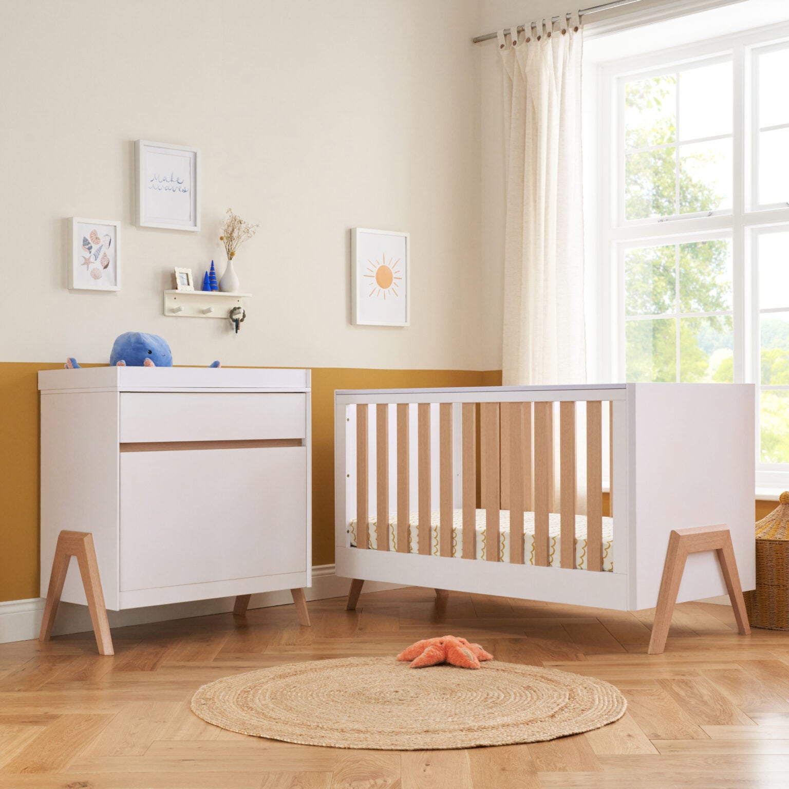 Meet the Tutti Bambini Fuori 2 Piece Nursery Furniture Set – White/Light Oak – a Scandinavian-inspired blend of modern simplicity and functionality. With exposed legs and a sleek appearance, this set is an ideal choice for those who desire a clean, contemporary nursery look. Practical and versatile, this set includes a cot bed that converts to a toddler bed or sofa and a chest changer with ample storage for all your baby’s essentials.
