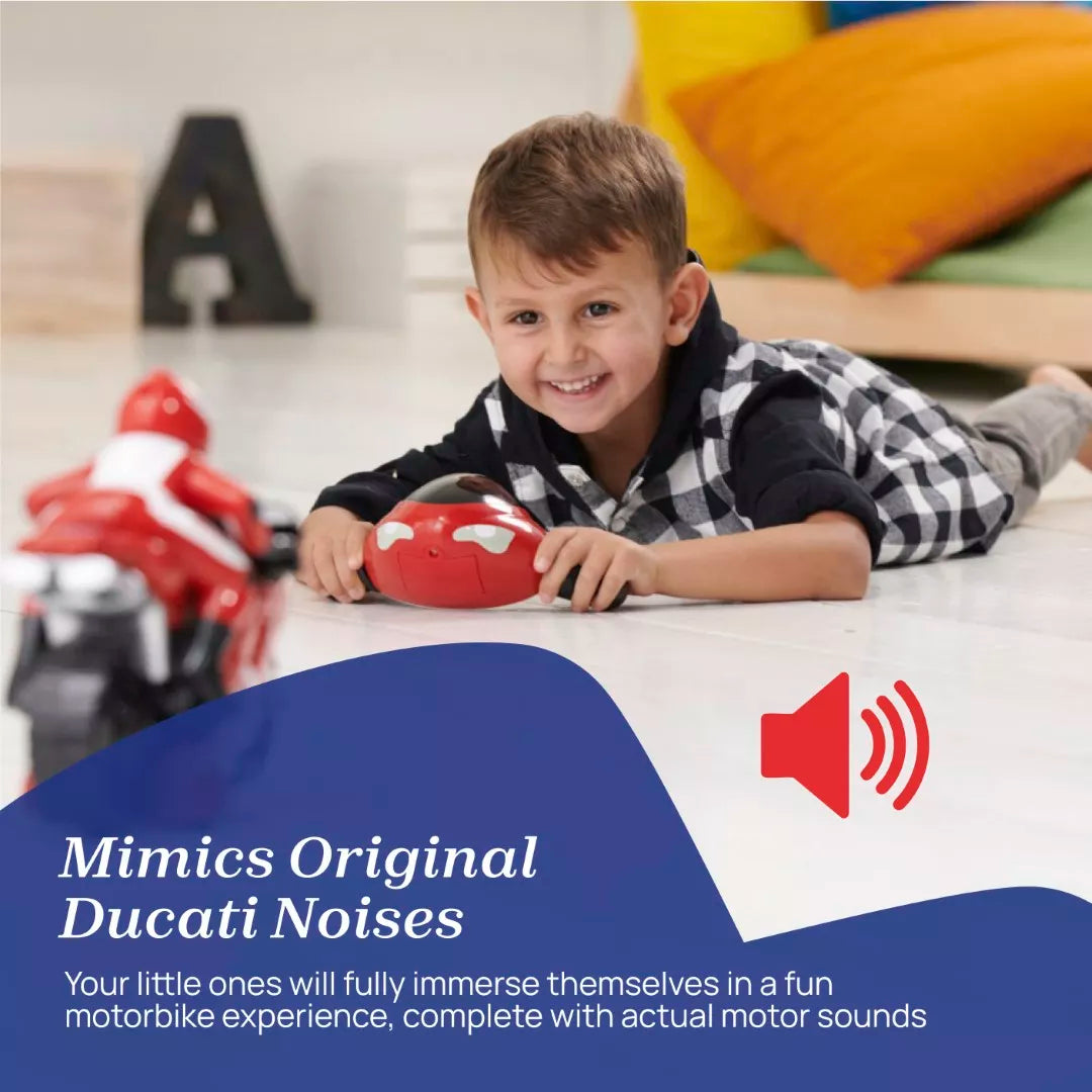 Officially licensed by Ducati, the Chicco Remote Control Bike is an exciting, immersive and educational toy your little ones will love. Watch them enjoy the high-speed thrills and sounds of a Ducati 1198 motorbike.