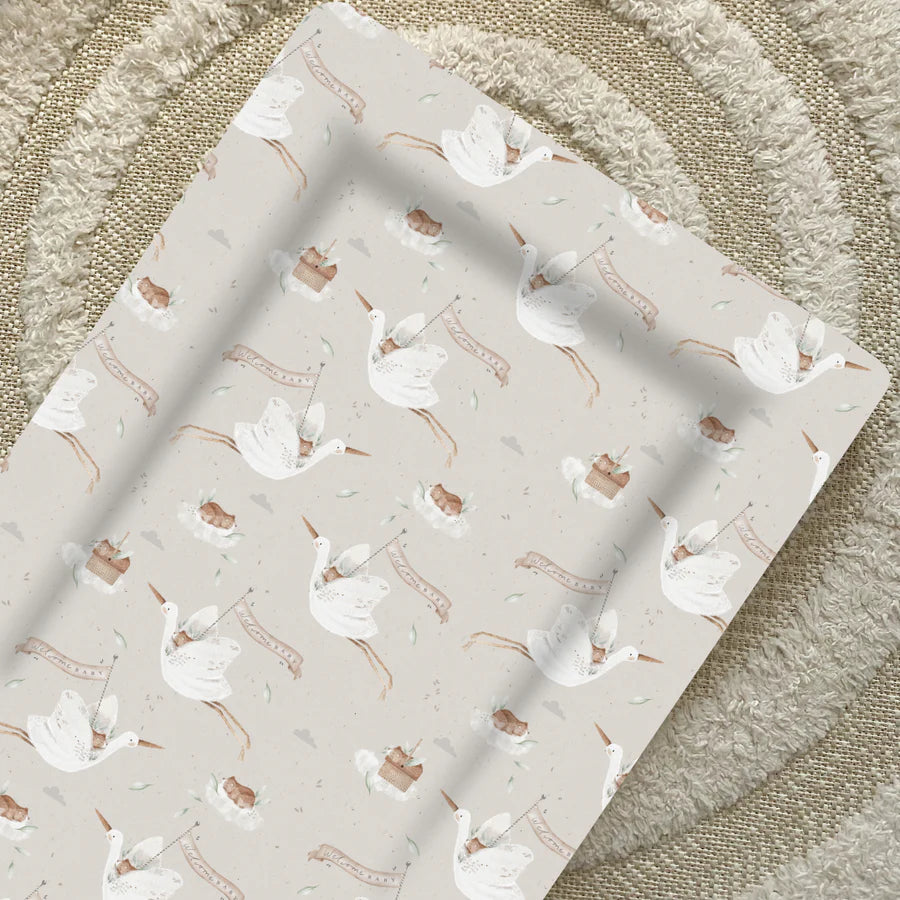 Celebrate new beginnings with the charming Welcome Baby Changing Mat, the latest addition to our gender-neutral collection. Featuring a whimsical stork carrying a baby bear with a banner that reads “welcome baby,” this beautifully illustrated design is set against a soft mushroom brown background—perfect for neutral nurseries and a thoughtful choice for baby showers.