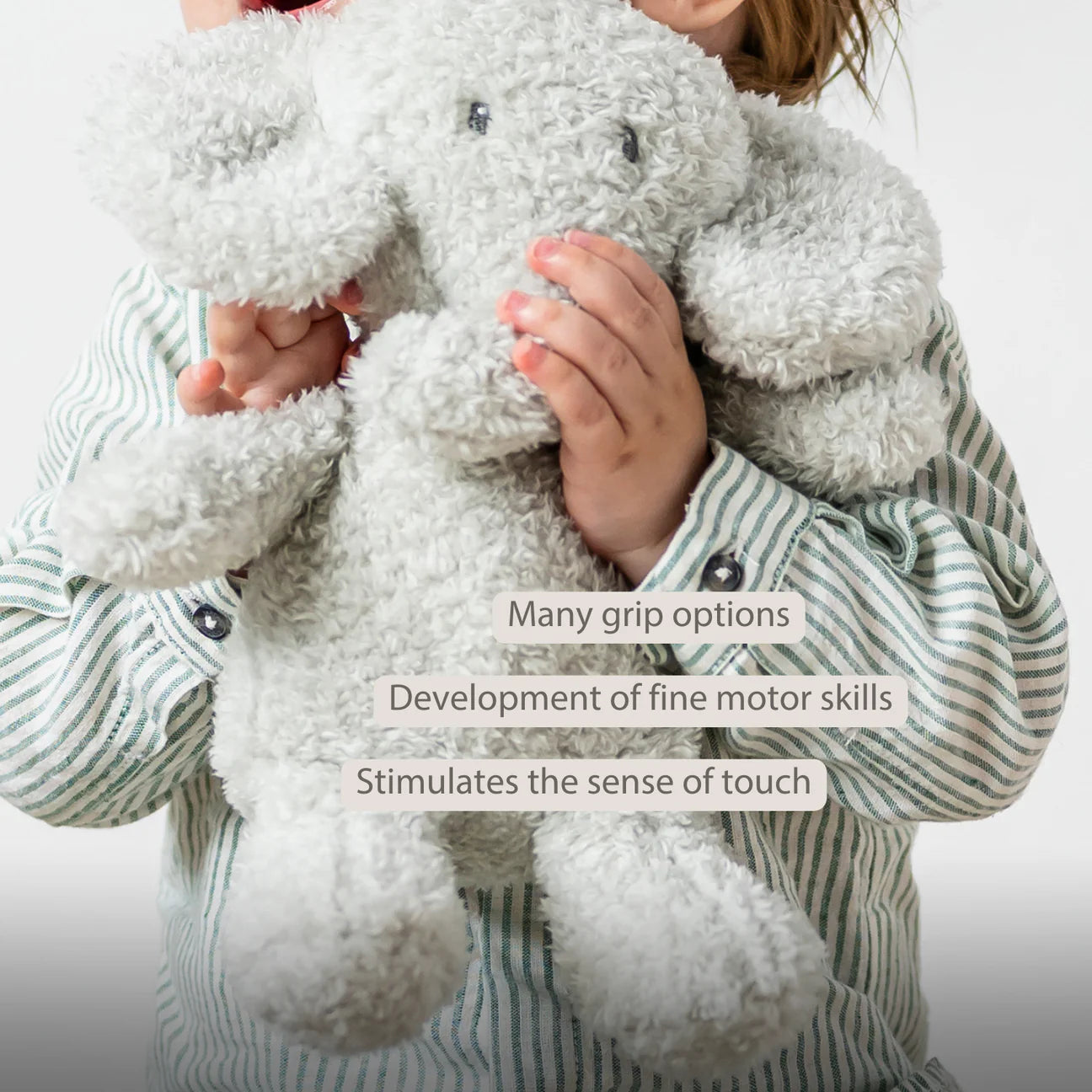The Nattou baby elephant plush immediately wins your child’s heart with its soft teddy fabric and adorable details. Its floppy ears and short trunk provide many gripping options for small hands, stimulating tactile senses and motor skills. With its compact 24 cm size, this elephant is ideal to take everywhere, from bed to stroller. A plush friend always ready to comfort, cuddle, and play. Also perfect as a baby gift.