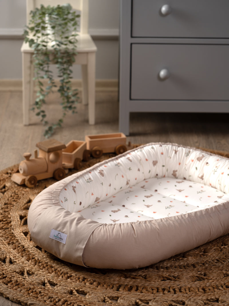 With its soft neutral tones and delicate grass print, this baby nest blends beautifully with any nursery décor while offering a cosy spot for your newborn to relax.