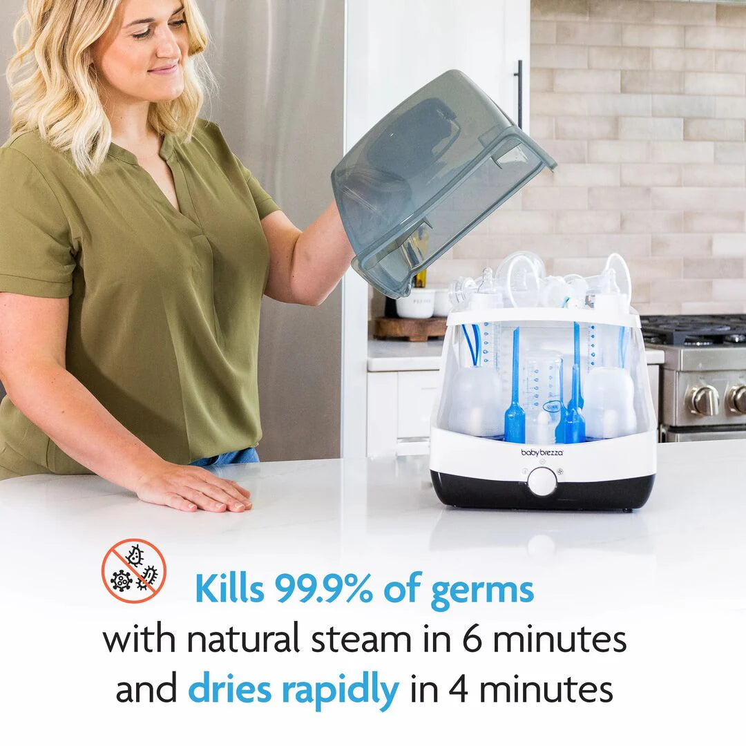 No more waiting around — the Baby Brezza SuperFast Steriliser-Dryer is the fastest steriliser-dryer on the market, completing a full cycle in just 10 minutes. That’s 75% faster than other brands, so you can sterilise on your schedule, not the other way around. It uses natural steam to kill 99.9% of germs, then automatically dries everything with hot air — all in one step. And once the cycle is done, contents stay sterilised for up to 48 hours when the lid remains closed. With a spacious, universal fit design, it holds up to 6 bottles, 2 full breast pump part sets (including wearables), plus dummies, cups, toys, and more. One-button control lets you easily switch between four functions, making this steriliser-dryer the fastest, smartest and most hygienic choice for busy parents.