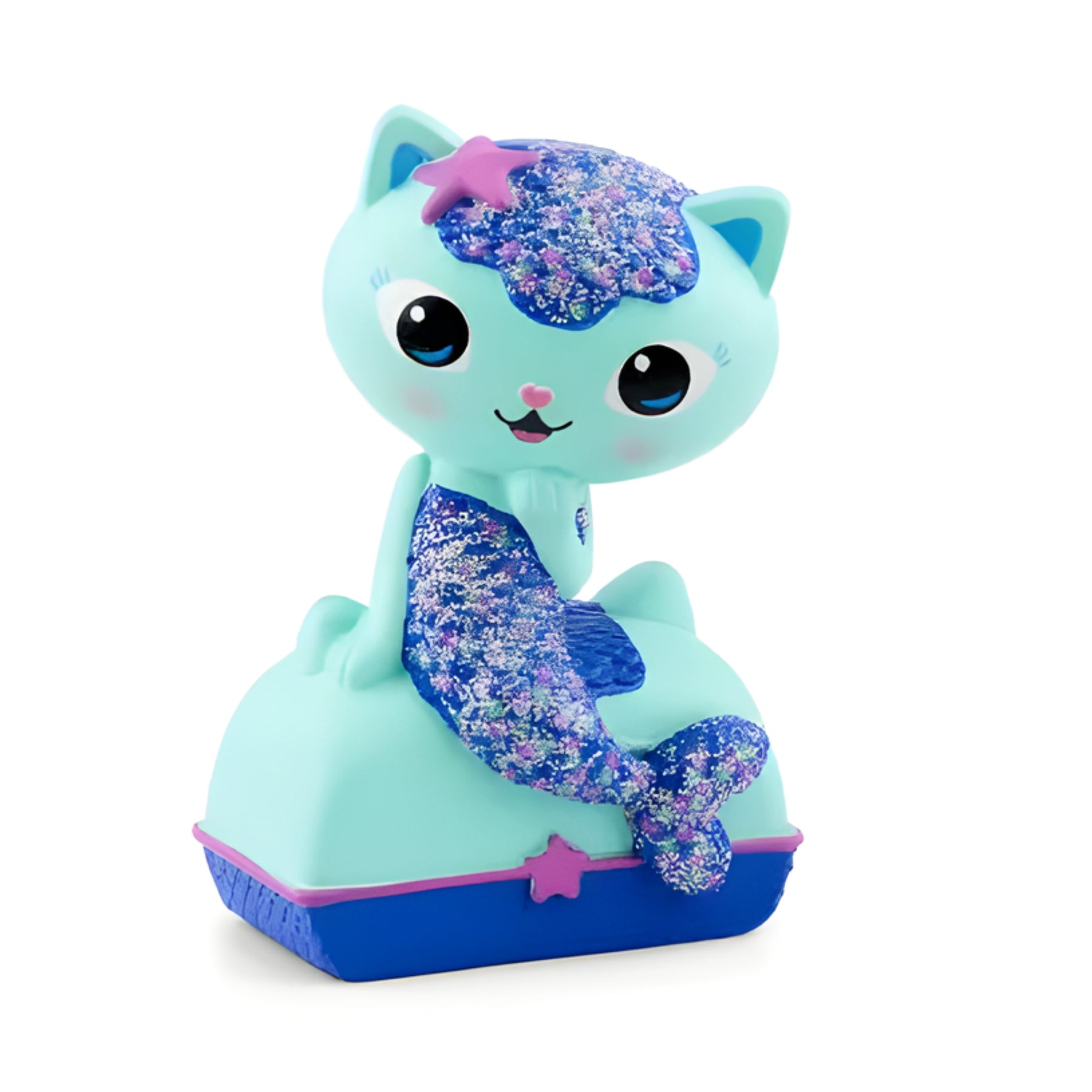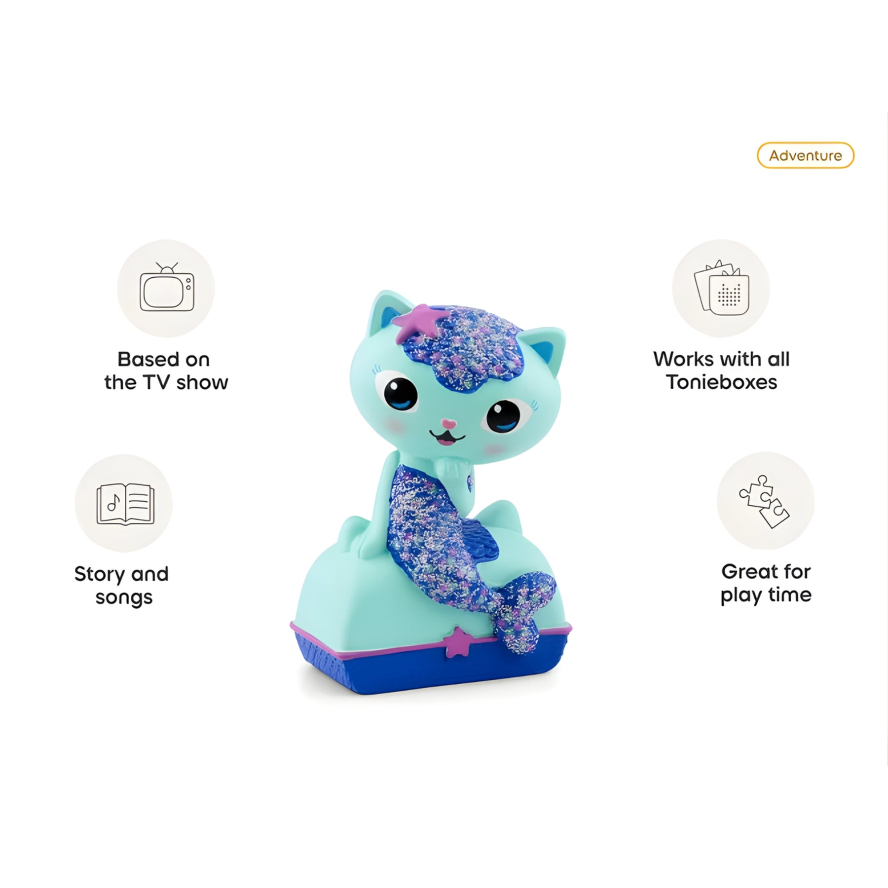 Gabby’s Dollhouse is a magical universe full of mini-worlds, kitty characters and big adventures that celebrate creativity and friendship. MerCat, half-cat, half-mermaid, is elegant, stylish and loves a bit of spa science. This Tonie features two audio adventures, music from the show and brand new recordings from Gabby herself, voiced by Laila Lockhart. All your little kitties need to do is pop this MerCat Tonie on their Toniebox to dive into a bubbly, bright new adventure.