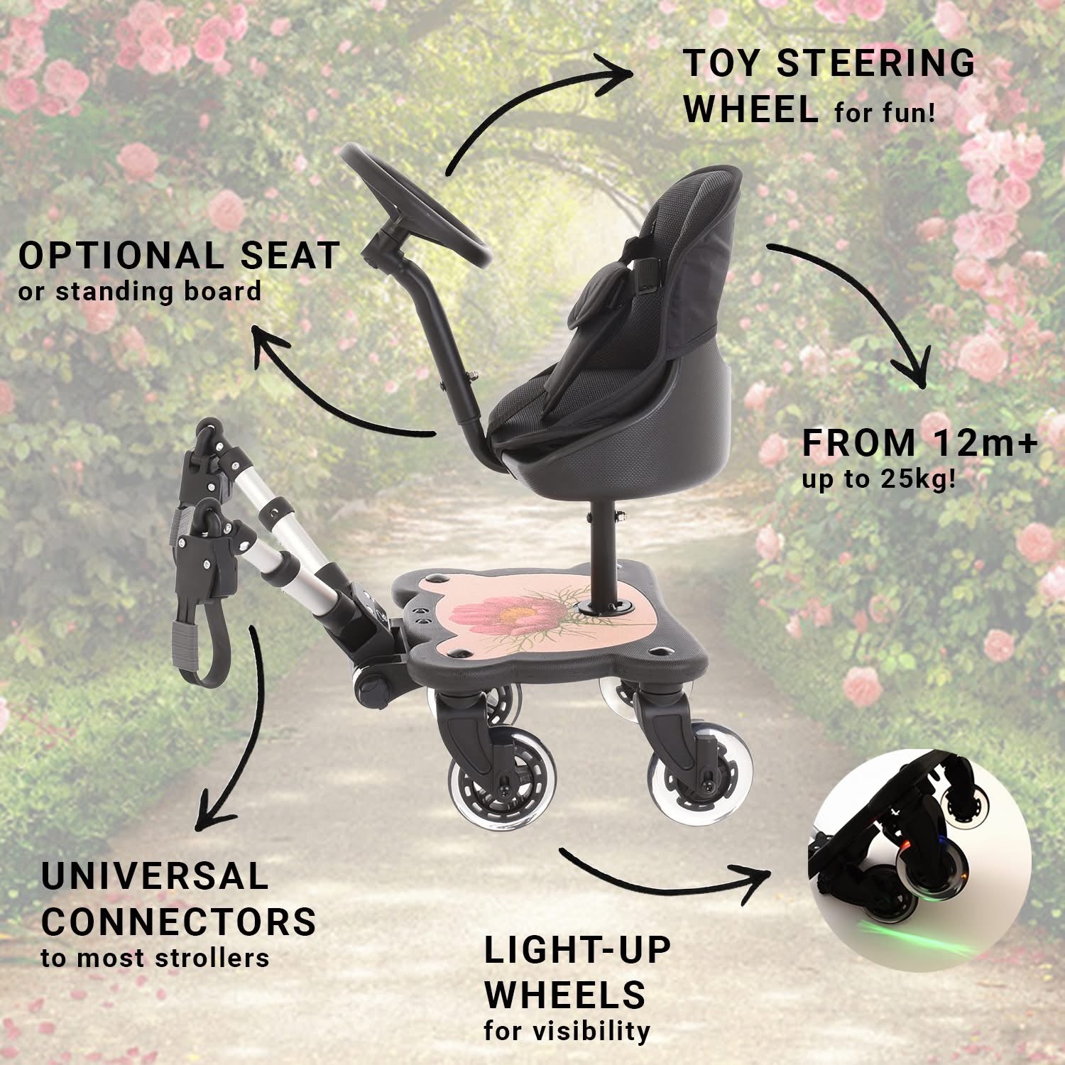 ROMA 4 RIDER TODDLER SEAT - 2 IN 1 BUGGY BOARD AND SEAT WITH STEERING WHEEL PLUS 4 WHEELS FOR BETTER STABILITY.